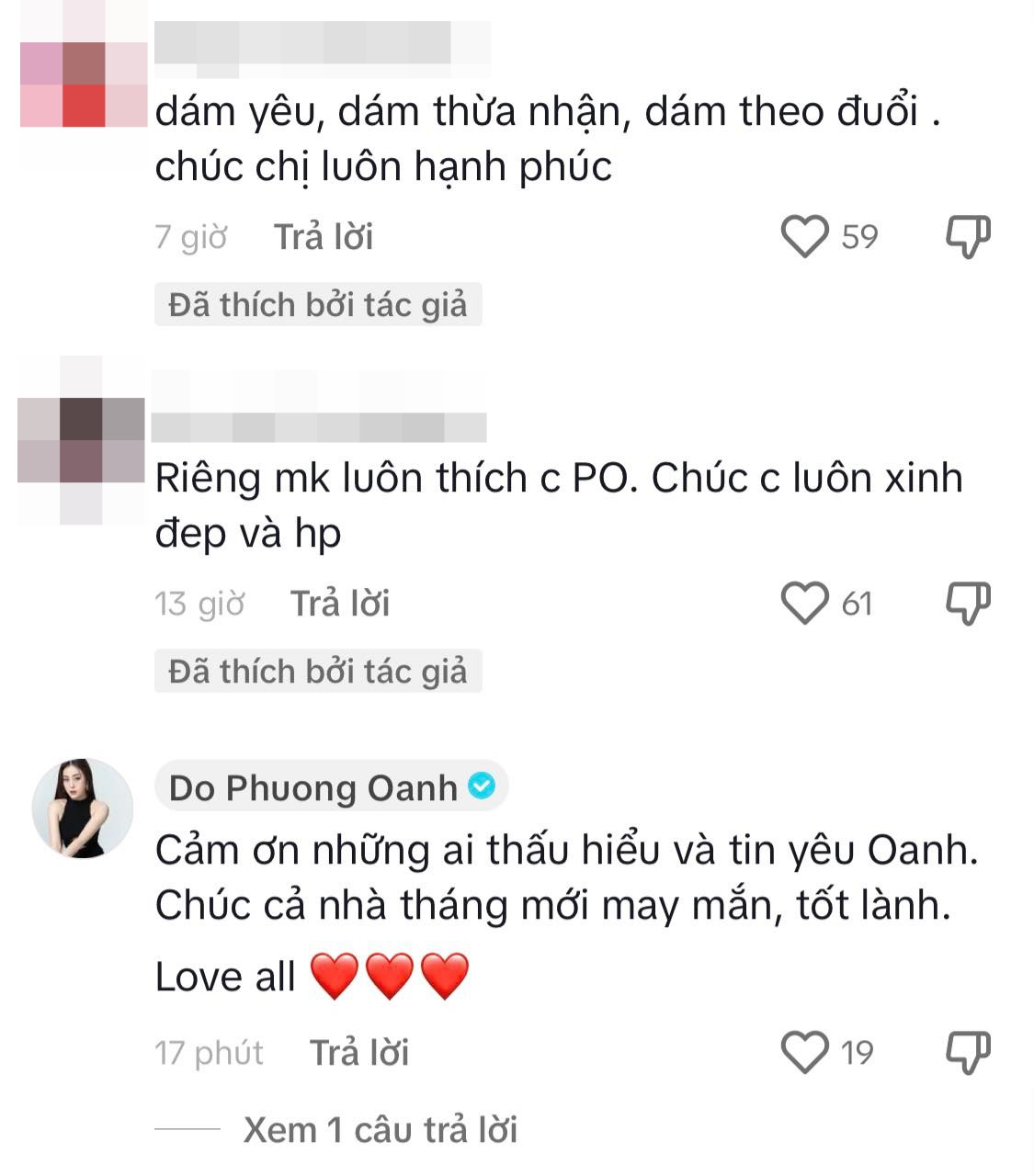 Mới đây nhất, trên Tiktok Phương Oanh vừa chia sẻ đoạn clip khoe visual xinh đẹp, sắc sảo cùng thần thái sang chảnh sau khi trở thành vợ hợp pháp của Shark Bình. Đến trưa ngày 19/6, Phương Oanh đã có chia sẻ mới. Theo đó, nữ diễn viên viết: "Cảm ơn những ai thấu hiểu và tin yêu Oanh. Chúc cả nhà tháng mới may mắn, tốt lành. Yêu tất cả mọi người".