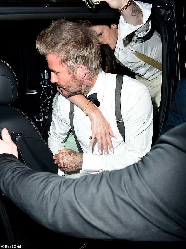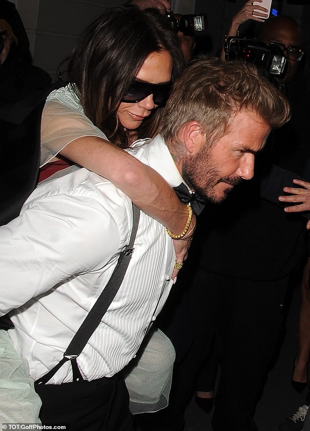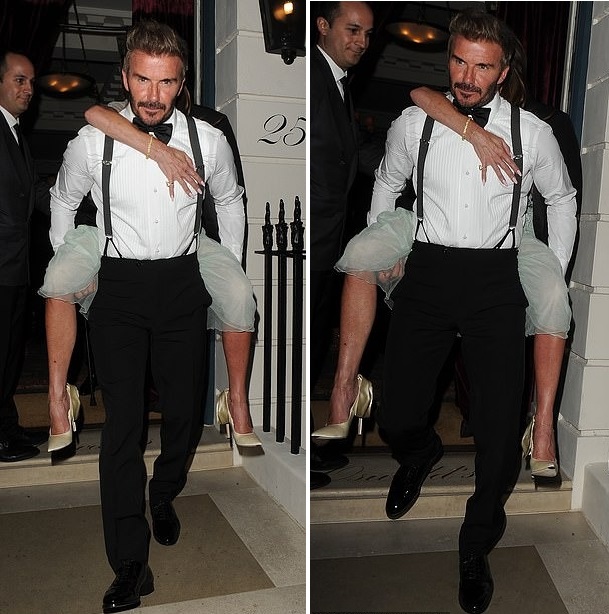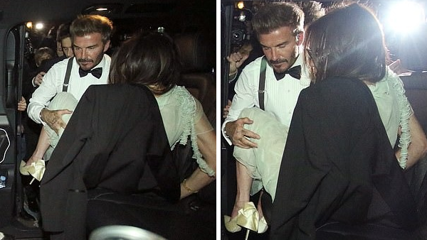 Biết vợ vẫn còn đau do vết gãy chân hồi tháng 2, David Beckham đã cõng vợ ra đến tận xe. Sau đó, ông bố 4 con cũng nhẹ nhàng đỡ Victoria lên xe, cẩn thận từng chút một để chân của bà xã không vướng phải xe. Hành động "chồng nhà người ta" này của ngài Becks khiến dân tình trầm trồ, hết lời ngợi khen.