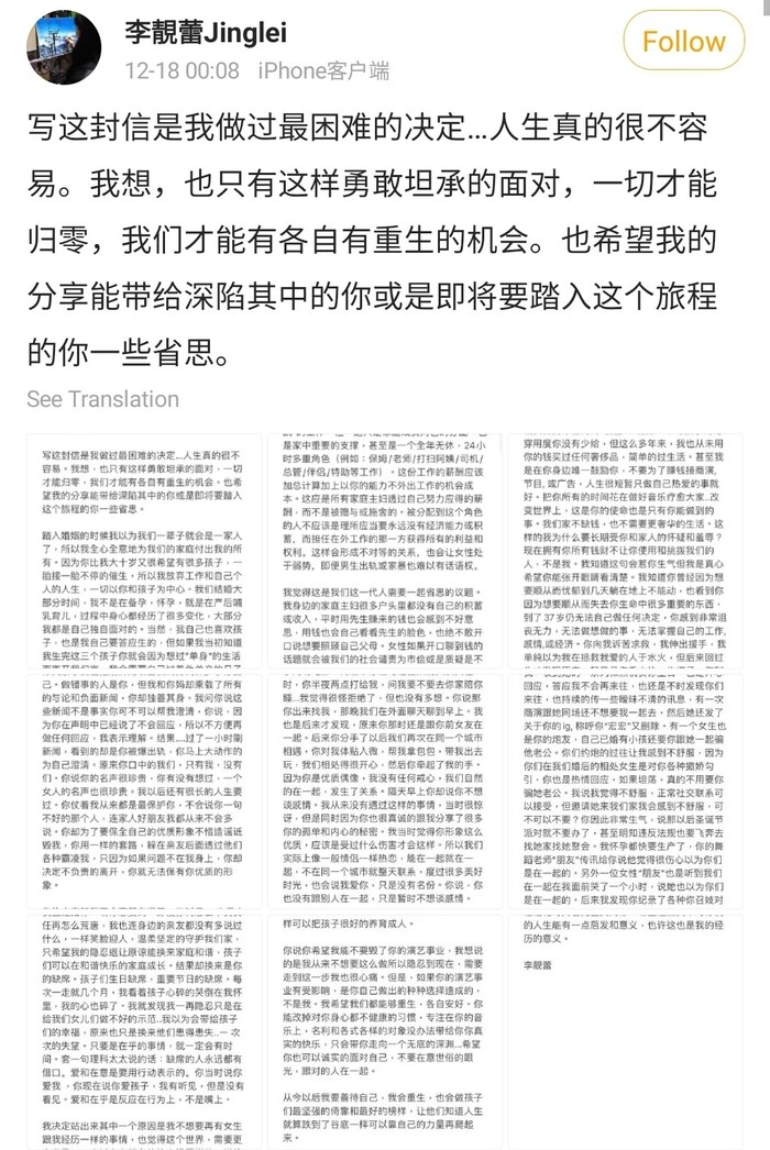 Vào tối ngày 16/12, Lý Tịnh Lôi đăng bài viết dài giãi bày về những năm tháng hôn nhân, cụ thể bài chia sẻ của cô như sau: