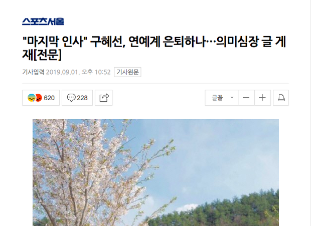 Hiện những bài báo về việc Goo Hye Sun ngầm tuyên bố giải nghệ đang đứng top đầu trên cổng thông tin Hàn Quốc Naver. Người hâm vô cùng bàng hoàng và bất ngờ vì cho rằng đây chính là tuyên bố giải nghệ của nữ diễn viên sau những biến cố thời gian gần đây, đặc biệt là vụ ly hôn với Ahn Jae Hyun.