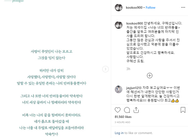 Tôi muốn gửi lời chào cuối cùng đến tất cả các bạn trước khi xuất bản cuốn sách mới của mình mang tên "I’m Your Companion Animal". Tôi muốn gửi lời cảm ơn chân thành tới tất cả mọi người vì đã dành cho tôi sự quan tâm và tình yêu thương suốt thời gian qua. Nhờ tất cả các bạn, tôi mới có thể đạt được ước mơ của mình.