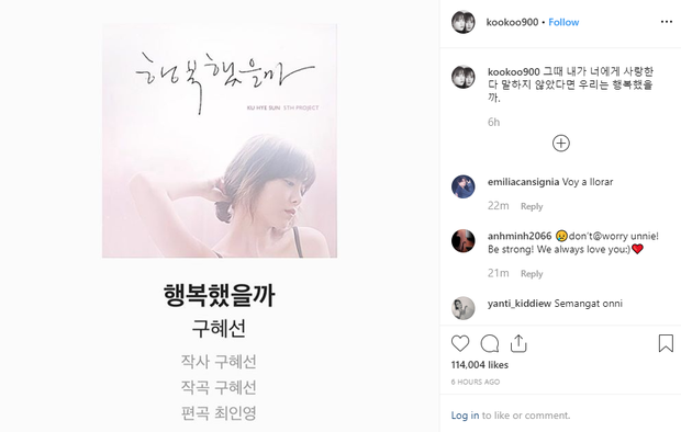 Trước đó cũng vào hôm nay, Goo Hye Sun đã đăng tải bức ảnh chụp màn hình bài hát "Happy" của chính cô kèm theo dòng trạng thái đầy tâm trạng: "Nếu ngày ấy tôi không nói yêu anh, liệu hai chúng ta có hạnh phúc?".