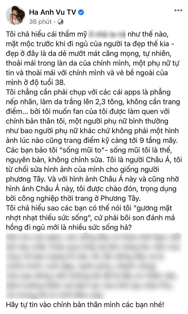 Trên trang cá nhân, Hà Anh đăng cận ảnh mặt không chút son phấn trước khi đi ngủ kèm lời khẳng định cô vô cùng tự tin với làn da căng mọng ở tuổi 38. Nữ siêu mẫu tiết lộ cô không muốn dùng các ứng dụng chỉnh sửa hình ảnh hay make up xinh đẹp lồng lộn vì muốn giữ hình ảnh bình dị, gần gũi trong mắt người hâm mộ. Đặc biệt, khi bị soi khuyết điểm sống mũi to, Hà Anh bức xúc: "Các bạn bảo tôi 'sống mũi to' - sống mũi tôi là thế, nguyên bản, không chỉnh sửa. Tôi là người Châu Á, tôi từ chối sửa hình ảnh của mình cho giống người phương Tây".