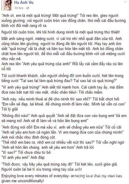 Cụ thể, siêu mẫu Hà Anh cho biết: "Các bạn thân mến, khi tôi chia sẻ câu chuyện tình yêu nho nhỏ của chúng tôi có chi tiết tôi nói đùa chồng chưa cưới của mình rằng "nếu thuê người đẻ hộ có được không?", rồi "khi em xấu xí anh có còn yêu em". Đó là những trăn trở nhõng nhẽo của người phụ nữ với người yêu.