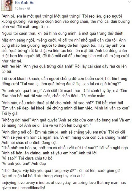 Hà Anh vừa chia sẻ đoạn tâm sự thú vị và đầy ngọt ngào giữa cô và chồng sắp cưới của mình. Trong khi cặp đôi vui đùa tinh nghịch và đầy tình cảm với nhau, Hà Anh bất ngờ đưa ra ý tưởng về việc thuê người đẻ. Như vậy cả hai có con, mà Hà Anh vẫn khỏe đẹp. Tuy nhiên, chồng sắp cưới của cô không đồng ý: "Anh sẽ đặt đứa con vào bụng em! Và em sẽ mang nó! Anh sẽ đi làm về và hôn lên bụng em!".