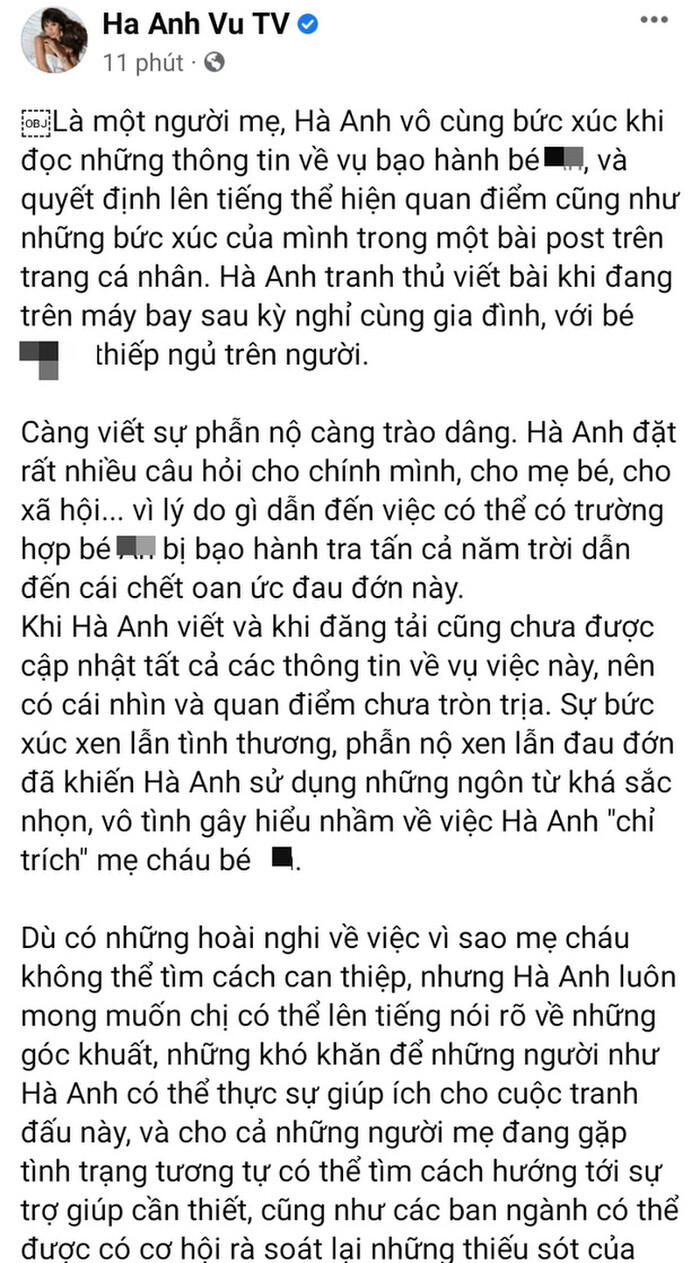 Cho đến tối ngày 4/1, Hà Anh đã có bài viết phân trần về vấn đề này trên trang cá nhân. Cụ thể, nữ siêu mẫu viết: "Vào tối ngày 01/01/2022, trên trang Facebook cá nhân của mình, tôi đã có những chia sẻ quan điểm cá nhân về câu chuyện đau lòng của bé gái N.T.V.A. (SN 2013) tại TP. Hồ Chí Minh.