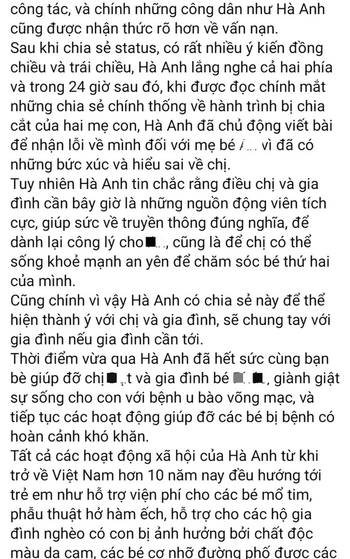 Sau khi tìm hiểu kỹ hơn về sự việc và mẹ đẻ của bé V.A, Hà Anh đã chính thức đưa ra lời xin lỗi. Cô đồng thời gửi lời chia buồn tới mẹ bé, xin phép xóa bài đăng gây tranh cãi để tránh gây thêm tổn thương đến người phụ nữ này. Nữ siêu mẫu cũng khẳng định mình không lợi dụng sự việc của bé gái 8 tuổi để quảng cáo. Mặc dù vậy, cô vẫn phải hứng chịu vô số lời chỉ trích, thậm chí MC Phương Mai còn đăng đàn "vỗ thẳng mặt" Hà Anh, cho rằng đàn chị "xin lỗi không thật tâm mà chỉ nhằm mục đích tẩy trắng".