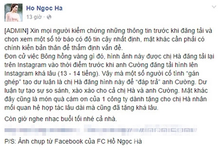 Đơn cử việc bông hồng vàng gì đó, hình ảnh này được chị Hà đăng tải lại trên Instagram vào thời điểm trước khi anh Cường đăng tải hình lên Instagram khá lâu (13 - 14 tiếng). Vậy mà một số người cố tình “gán ghép” tạo dư luận là chị Hà đăng hình này để “đáp trả” anh Cường. Dư luận tự tạo sự so sánh, xào xáo cho cả chị Hà và anh Cường. Mặt khác đây cũng là món quà cám ơn của 1 công ty dành tặng cho chị Hà nhân mối quan hệ hợp tác lâu dài mà cũng đã tặng khá lâu".