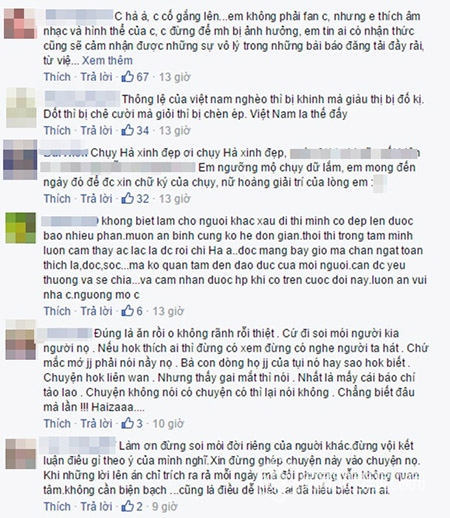 Ngay khi status này được đăng tải, nhiều người hâm mộ Hà Hồ đã nhanh chóng gửi lời động viên thần tượng bằng những bình luận tích cực.