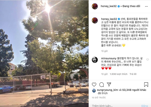 Trước sức ép quá lớn từ cộng đồng mạng, "Hoa hậu Hàn đẹp nhất thế giới" Honey Lee đã phải xóa hết ảnh và gửi lời xin lỗi: "Tôi chỉ muốn chúc mừng các tiền bối và đồng nghiệp của mình thôi, nhưng tôi vẫn muốn xin lỗi nếu đã khiến các bạn cảm thấy không thoải mái hay giận dữ vì hành động này. Tôi nghĩ rằng mình đã quá sốt sắng khi chia sẻ cảm xúc cá nhân để chúc mừng họ. Một lần nữa, tôi xin được cúi đầu xin lỗi chân thành và xin được tự hào nói lời chúc mừng tới những người đồng nghiệp đã làm nên lịch sử cho nền điện ảnh xứ Hàn. Chúc các bạn có một ngày tốt lành".