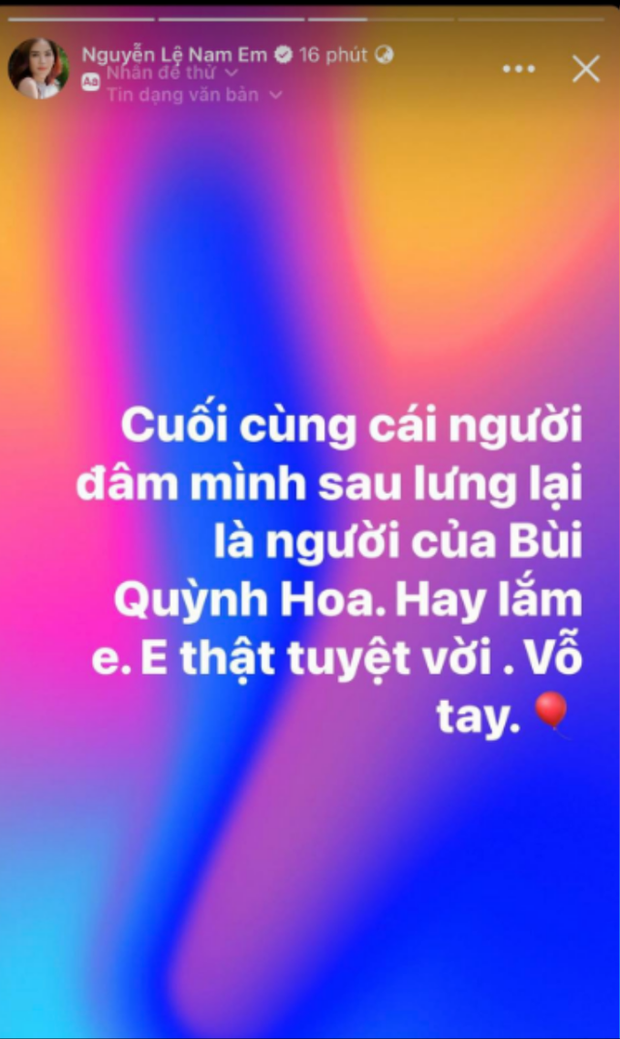 Cũng chỉ cách đây vài ngày, Bùi Quỳnh Hoa trở thành cái tên nổi tiếng xuất hiện trong câu chuyện của Nam Em. Vào ngày 7/12, Nam Em bất ngờ đăng đàn: "Cuối cùng người đâm mình từ phía sau lại là người của Bùi Quỳnh Hoa. Hay lắm em, tuyệt vời, vỗ tay". Người đẹp sinh năm 1996 còn thẳng thừng mỉa mai đàn em bằng biểu tượng quả bóng, ám chỉ scandal hút bóng cười của Bùi Quỳnh Hoa.