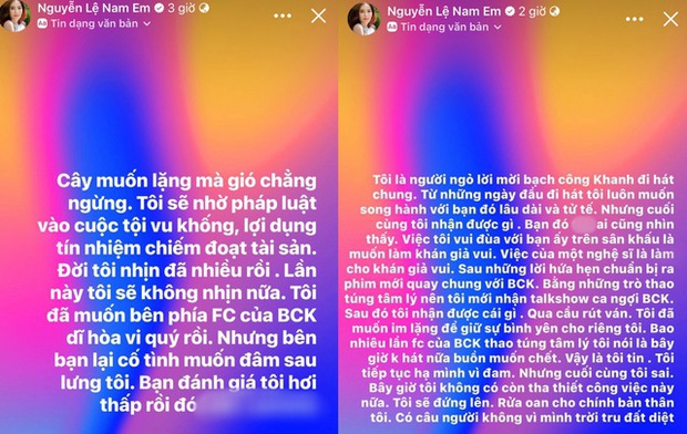 "Sau những lời hứa hẹn chuẩn bị ra phim mới quay chung với Bạch Công Khanh. Bằng những trò thao túng tâm lý nên tôi mới nhận talkshow ca ngợi Bạch Công Khanh. Sau đó tôi nhận được cái gì. Qua cầu rút ván. Tôi đã muốn im lặng để giữ sự bình yên cho riêng tôi. Bao nhiêu lần FC của Bạch Công Khanh thao túng tâm lý tôi nói là bây giờ không hát nữa buồn muốn chết. Vậy là tôi tin. Tôi tiếp tục hạ mình. Nhưng cuối cùng tôi sai. Bây giờ tôi không có còn tha thiết công việc này nữa. Tôi sẽ đứng lên rửa oan cho chính bản thân tôi", Nam Em chia sẻ.