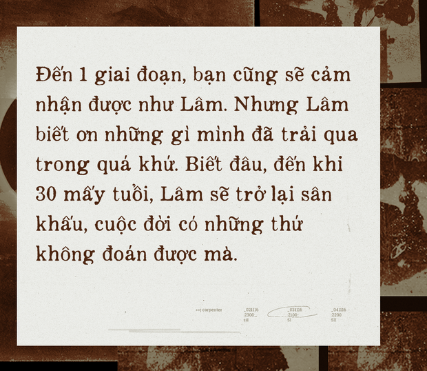 Đến giờ Lâm sợ showbiz thị phi lắm, mọi thứ Lâm đã trải và nếm đủ nên đã đến lúc phải dừng lại. Đến 1 giai đoạn, bạn cũng sẽ cảm nhận được như Lâm. Nhưng Lâm biết ơn những gì mình đã trải qua trong quá khứ. Biết đâu, đến khi 30 mấy tuổi, Lâm sẽ trở lại sân khấu, cuộc đời có những thứ không đoán được mà.