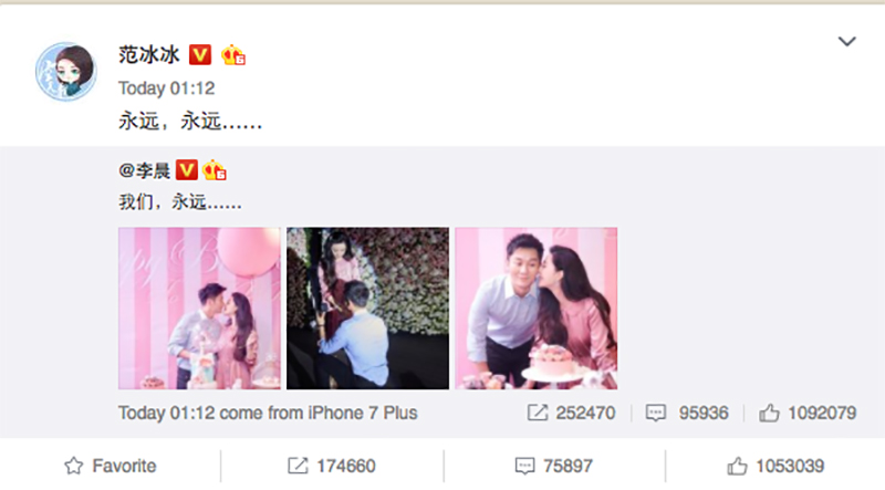 Ngày 29/5, Phạm Băng Băng bất ngờ chia sẻ hình ảnh bên Lý Thần. Cô ghi chú tên anh và đưa ra thông điệp "chúng tôi", xác thực việc cả hai giờ là một.