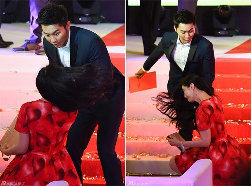 Nam diễn viên ngay lập tức đỡ cô dậy. Hành động vô vùng ngọt ngào này chứng tỏ tình cảm nồng nàn mà Lý Thần dành cho cô.