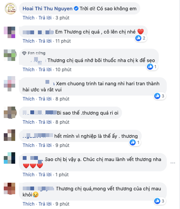 Ngay lập tức, dưới phần bình luận đông đảo người hâm mộ đã rất lo lắng cho Hari Won. Netizen liên tục gửi lời động viên, mong Hari Won được sớm lành vết thương. Hoa hậu Thu Hoài cũng bày tỏ sự xót xa khi biết đàn em gặp tai nạn nghề nghiệp: "Trời ơi, có sao không em". Thời gian tới phải tham gia ghi hình trong nhiều chương trình, bà xã Trấn Thành gây lo lắng khi gặp phải sự cố này.