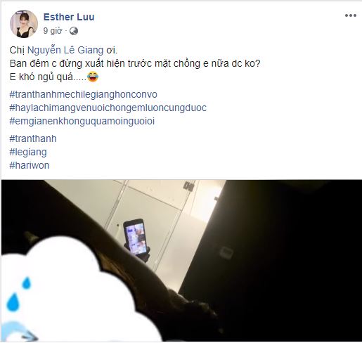 Cực chẳng đã, Hari Won phải lên mạng xã hội "năn nỉ" người chị thân thiết: "Chị Nguyễn Lê Giang ơi, ban đêm chị đừng xuất hiện trước mặt chồng em nữa được không? Em khó ngủ quá". Không chỉ có thế, bà xã Trấn Thành còn đính kèm cả loạt hashtag van nài với nội dung: "Trấn Thành mê chị Lê Giang hơn mê vợ", "Hay là chị mang chồng em về nuôi luôn cũng được", "Em già nên em khó ngủ mọi người ơi!",...