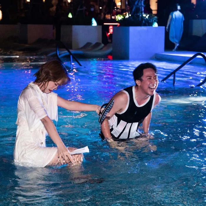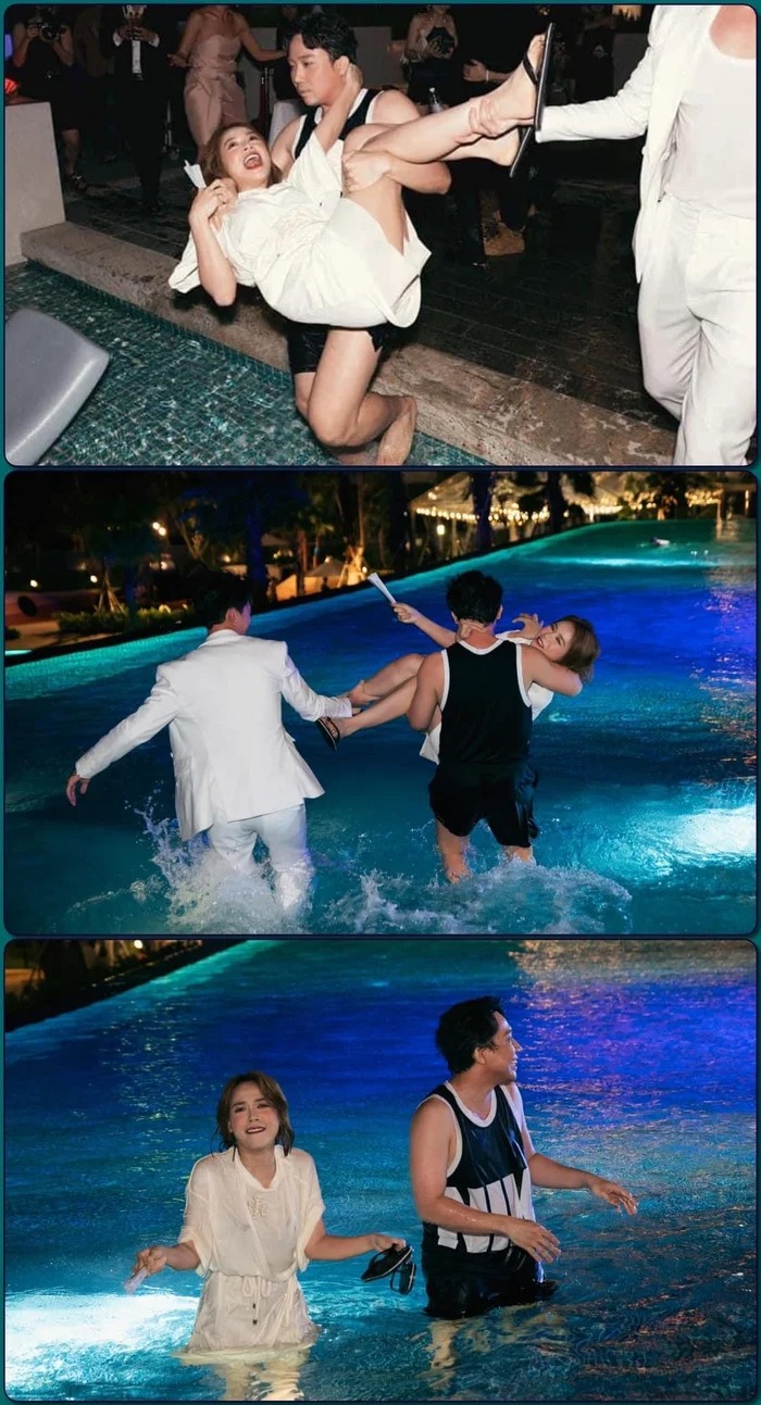 Trấn Thành liền biện minh: “Có khiêng được vợ mà, hồi xưa yếu giờ mạnh rồi”. Ngay dưới bài đăng, Sam cũng để lại dòng bình luận: “Chị Ri ơi khiêng kiểu này hông ham đâu. Em sứt luôn cặp mi giả với uống mấy lít nước hồ bơi rồi”. Không chỉ có Sam là nạn nhân bị Trấn Thành ném xuống hồ trong đám cưới Diệu Nhi - Anh Tú, Tiến Luật nhân cơ hội “bóc phốt” Trấn Thành: “Ủa uống vang pha tăng lực hay gì mà vác gần hết khách mời”.
