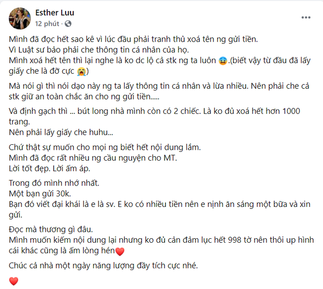 Hari Won chia sẻ: "Mình đã đọc hết sao kê vì lúc đầu phải tranh thủ xóa tên người gửi tiền. Vì luật sư bảo phải che thông tin cá nhân của họ. Mình xóa hết tên thì lại nghe là không được lộ cả số tài khoản người ta luôn. Mà nói gì thì nói dạo này người ta lấy thông tin cá nhân và lừa nhiều. Nên phải che cả số tài khoản giữ an toàn chắc ăn cho người gửi tiền. Và định gạch thì bút lông nhà mình còn có 2 chiếc không đủ xóa hết hơn 1000 trang nên phải lấy giấy che. Chứ thật sự muốn cho mọi người biết hết nội dung lắm. Mình đã đọc rất nhiều người cầu nguyện cho miền Trung lời tốt đẹp, lời ấm áp".