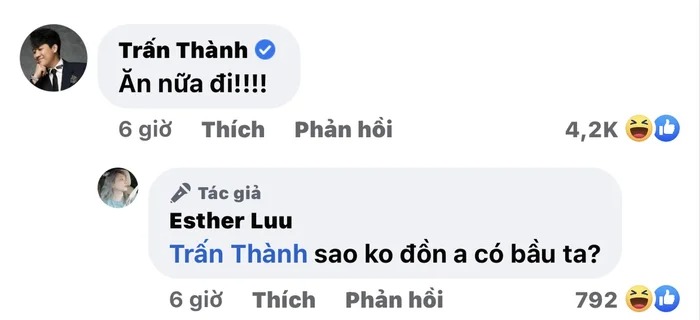 Ngay dưới bài viết, Trấn Thành cũng để lại bình luận như "dằn mặt" bà xã: "Ăn nữa đi". Đáp lại, Hari Won cũng hài hước trêu chồng: “Sao không đồn anh có bầu ta?”. Màn tương tác vui vẻ, tự nhiên này đã dập tan tin đồn chia tay của Trấn Thành và Hari Won những ngày qua.
