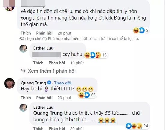Trong khi đó, Quang Trung bày tỏ nghi ngờ: "Hay là chị bầu thiệt". Nữ ca sĩ lập tức đáp: "Thà có thiệt chị thấy đỡ tức, chứ bụng chị hiện giờ bự thiệt".