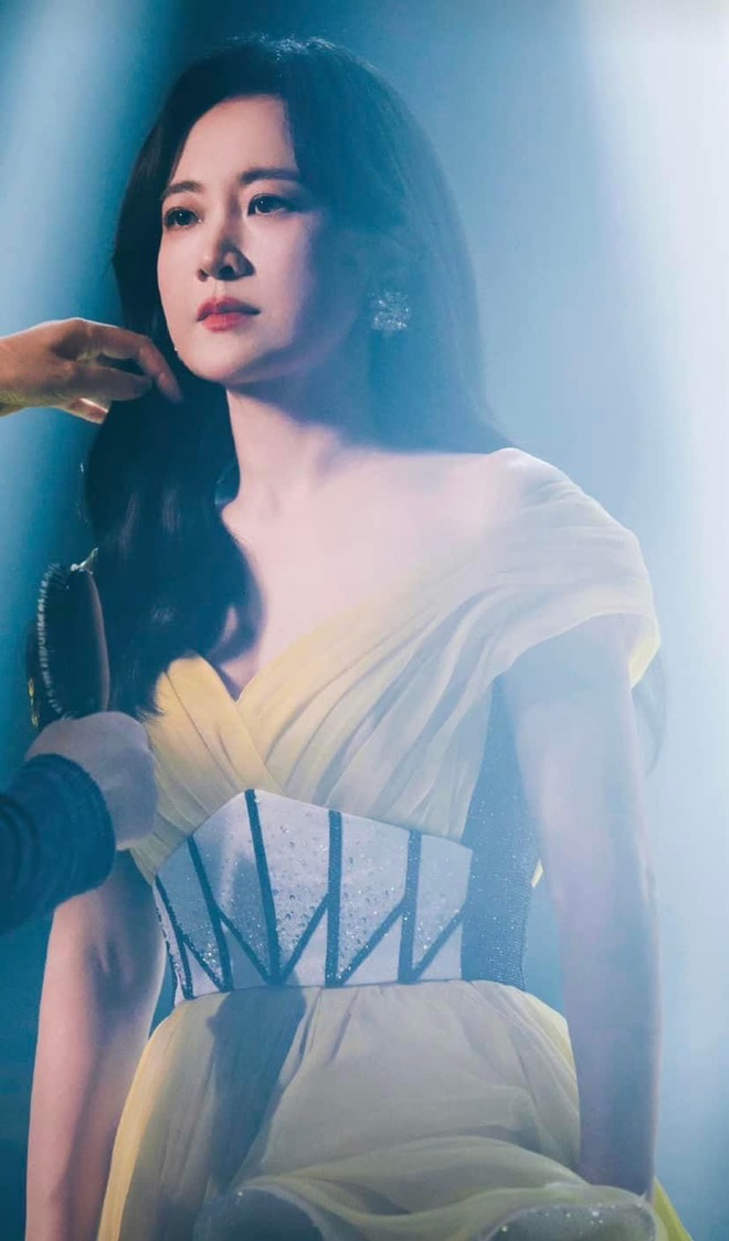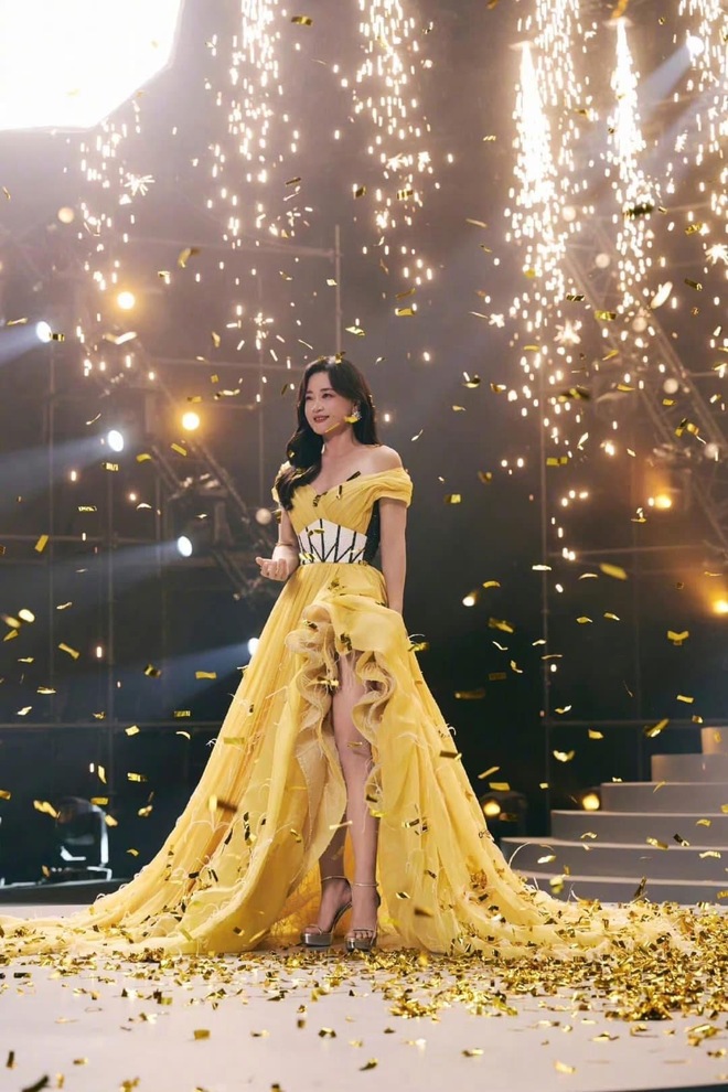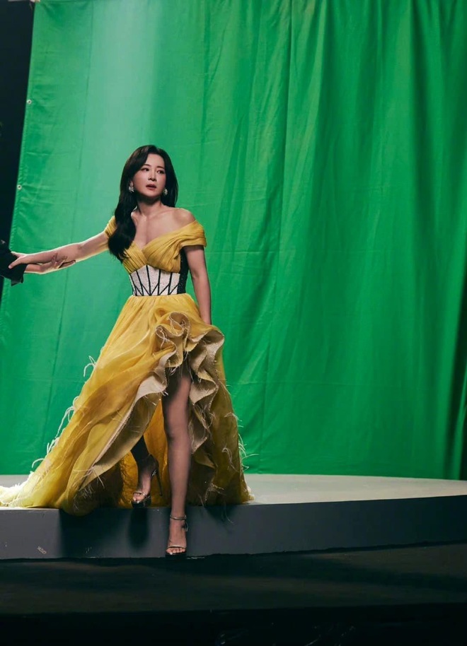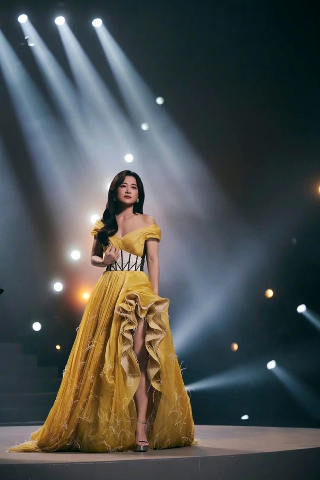 Giả Linh vô cùng lộng lẫy, kiêu sa trong bộ váy trễ vai thướt tha, bồng bềnh cùng điểm nhấn cách điệu, tua rua đẹp mắt. Hậu giảm cân, nữ diễn viên khoe trọn thân hình thon gọn, quyến rũ không chút mỡ thừa. Kiểu tóc xoăn cùng tông trang điểm nhẹ nhàng cũng giúp diện mạo cô thêm phần đằm thắm, yêu kiều