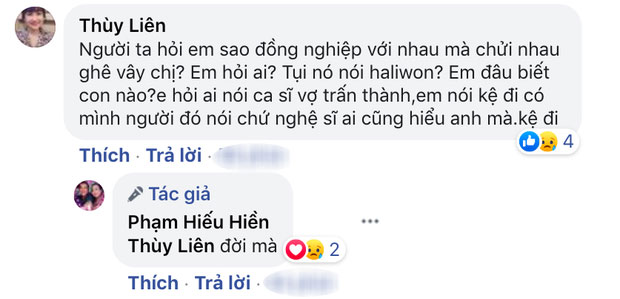 Điều đáng nói, dưới phần bình luận, vợ Hiếu Hiền còn vào nhắc hẳn tên Hari Won và nói về nữ ca sĩ với thái độ không mấy lịch sự: "Người ta hỏi em sao đồng nghiệp với nhau mà chửi nhau ghê vậy chị? Em hỏi ai? Tụi nó nói Hari Won? Em đâu biết con nào? Em hỏi ai, nói ca sĩ vợ Trấn Thành. Em nói kệ đi có mình người đó nói chứ nghệ sĩ ai cũng hiểu anh mà. Kệ đi". Đáp lại bà xã, Hiếu Hiền tiếp tục khẳng định: "Đời mà".