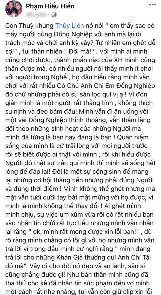 Cụ thể, Hiếu Hiền cho biết anh nhận được câu hỏi của bà xã: "Em thấy sao có mấy người cùng đồng nghiệp với anh mà lại đi trách móc và chửi anh kỳ vậy? Tự nhiên em ghét dễ sợ!", anh đã đáp lại rằng: "Đời mà", đồng thời khẳng định mình là người thẳng tính, không thích xu nịnh hay đeo bám ai.
