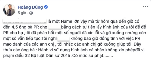 "Thực ra, với việc bịa đặt này, tôi có thể kiện họ, nhưng tôi không muốn làm to chuyện, muốn họ tự giác gỡ hết quảng cáo đi. Và sau khi đưa lên Facebook một số đơn vị đã đã gỡ hết những hình ảnh trái phép", nghệ sĩ Hoàng Dũng thẳng thắn lên tiếng khi vướng phải những lùm xùm không đáng có.