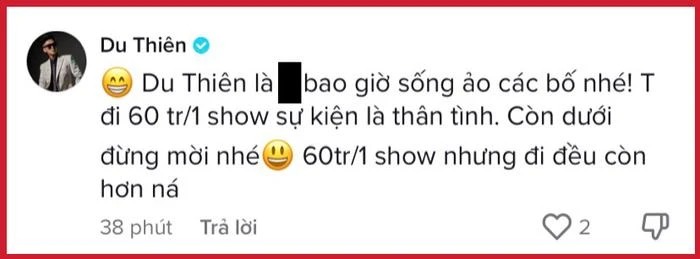 Du Thiên (SN 1985) được biết đến nhiều với vai trò là một ca sĩ. Anh thường xuyên đi hát tại hội chợ, các quán bar, lounge,... Chính chủ từng tiết lộ cát-sê của mình là 60 triệu, tuy nhiên con số này có thể cao hơn tùy vào yêu cầu từ đối tác.