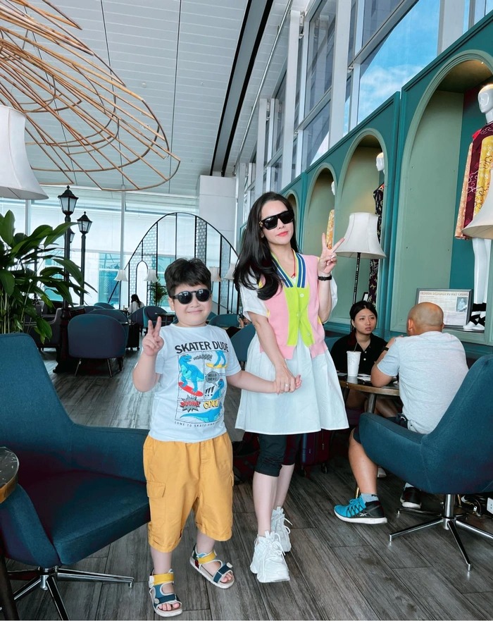 Tối 3/8, Nhật Kim Anh đã khoe hẳn khung ảnh bên cu Tin và chồng cũ Bửu Lộc. Nữ diễn viên hào hứng viết: "Chuyến xuất ngoại đầu tiên của mẹ con mình. Như mẹ đã hứa, con học giỏi có giấy khen là sẽ thưởng chuyến đi du lịch cùng ba mẹ. Và giờ mẹ đã thực hiện lời hứa nhé. Con phải cố gắng học giỏi và chăm ngoan hơn nữa, cục vàng của mẹ nha".