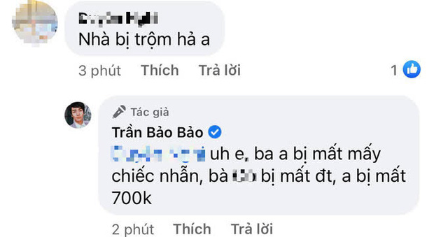 Đáng nói hơn, "người chơi hệ lầy lội" này còn nhắn nhủ với kẻ gian: "Đây là hiện trường mà bạn trộm bỏ lại cái túi, cách sắp xếp cũng nghệ lắm nha, chứng tỏ bạn này cũng có tư duy và thẩm mỹ lắm à". Mặc dù thế, nhiều khán giả cũng nhắc nhở nam diễn viên và gia đình nên đề phòng hơn để tránh bị kẻ trộm tấn công gây thiệt hại tài sản.