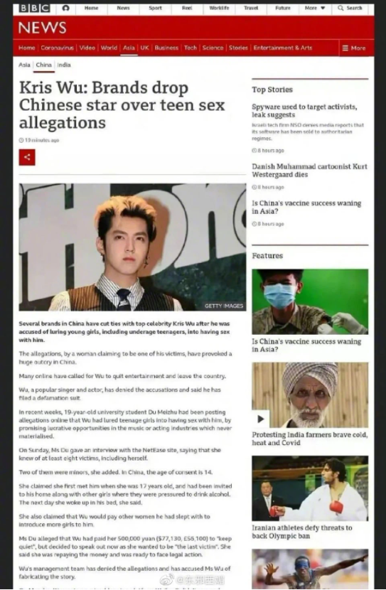 Trong 1 diễn biến khác, truyền thông quốc tế cũng đã quyết định vào cuộc và đưa tin về vụ việc. Chẳng ai có thể ngờ rằng, Kris Wu (tên tiếng Anh của Ngô Diệc Phàm) lại "vang danh thế giới" theo cách không ngờ. Các tờ báo lớn như BBC, HYPEBEAST, WWD đều cho những dòng tít tóm tắt scandal gây sốc này, chứng tỏ độ ồn ào của cái tên Ngô Diệc Phàm đã vượt qua lãnh thổ Trung Quốc và "vươn tầm" thế giới.