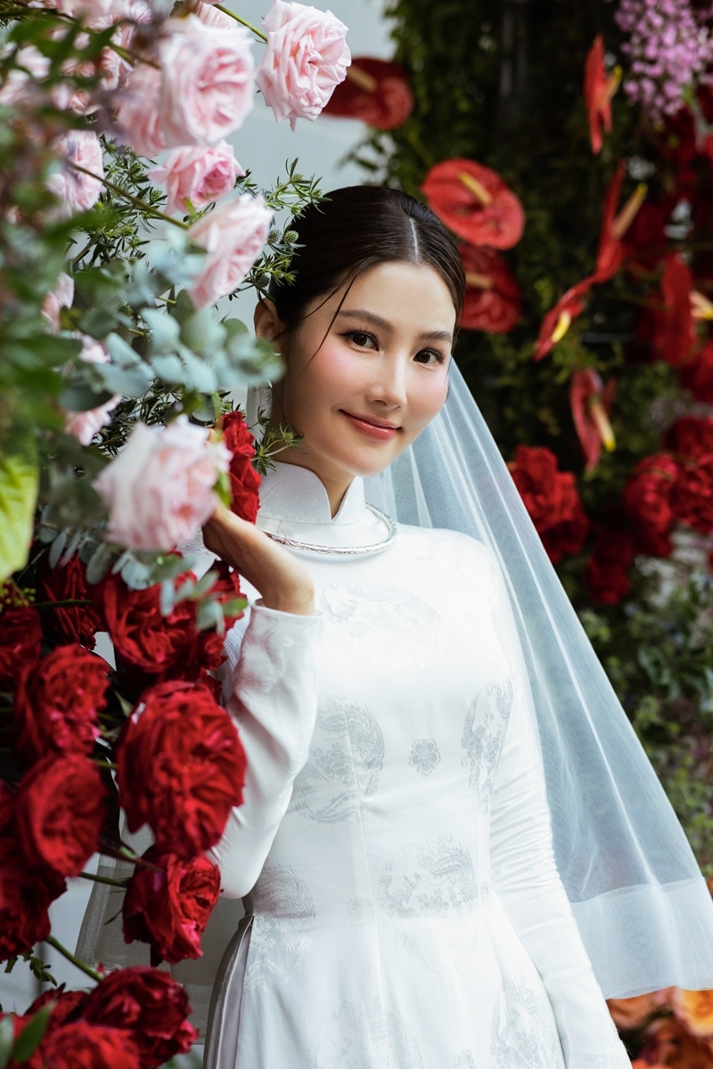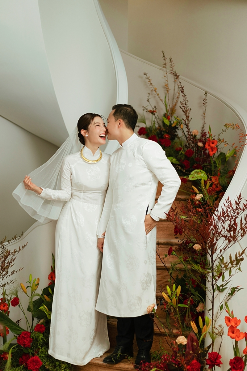 Mới đây, Diễm My 9X cùng ông xã Vinh Nguyễn đã làm lễ gia tiên tại nhà riêng ở Quận 7 (TP.HCM). Trong ngày trọng đại, Diễm My nền nã trong tà áo dài trắng, búi tóc và trang điểm nhẹ nhàng, kết hợp voan cài thướt tha.