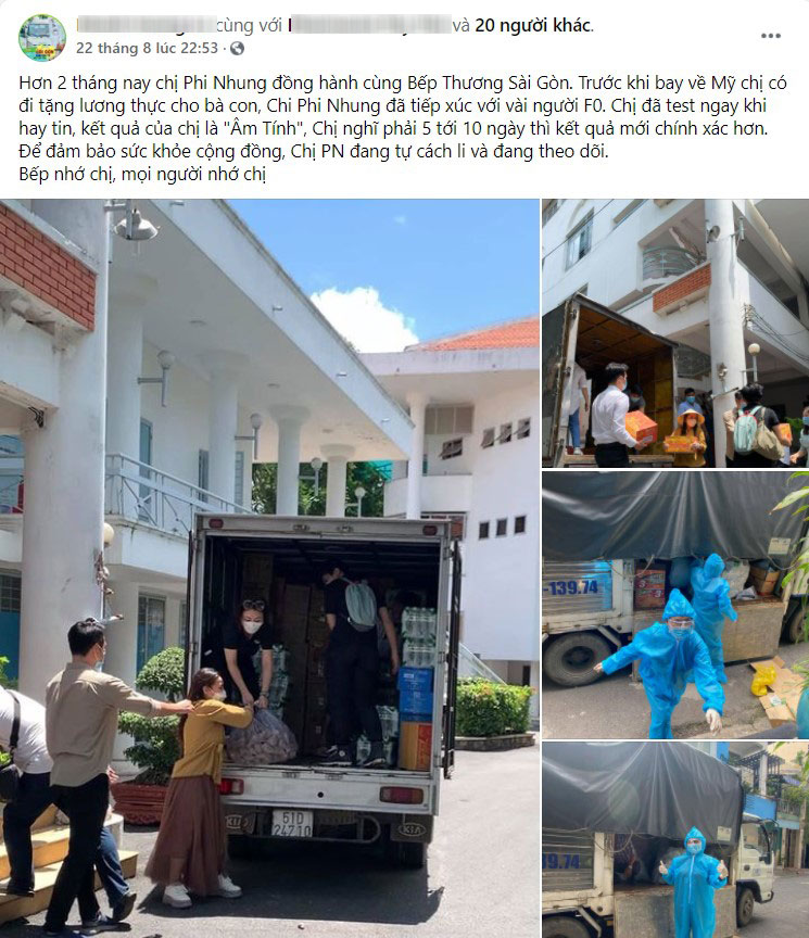 Được biết, hơn 2 tháng nay, Phi Nhung đã đồng hành cùng một bếp ăn tại TP.HCM để chuẩn bị khẩu phần ăn mỗi ngày cho bà con bị ảnh hưởng bởi dịch bệnh. Trước khi bay về Mỹ để tổ chức sinh nhật cho con gái ruột Wendy, nữ ca sĩ đã đi phát lương thực, nhu yếu phẩm cho người dân gặp khó khăn và có tiếp xúc với vài người F0. Phi Nhung đã thực hiện test nhanh tại chỗ và nhận kết quả âm tính, nhưng để đảm bảo an toàn, nữ ca sĩ đã tự cách ly tại nhà nhiều ngày trước khi nhập viện vì phát hiện dương tính với virus SARS-CoV-2.