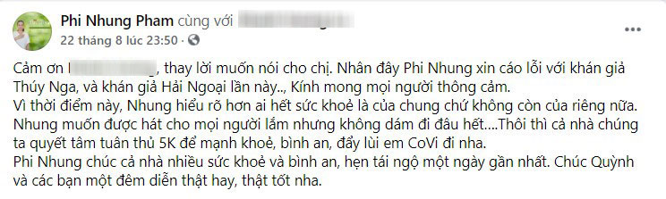 Vì thời điểm này, Nhung hiểu rõ hơn ai hết sức khoẻ là của chung chứ không còn của riêng nữa. Nhung muốn được hát cho mọi người lắm nhưng không dám đi đâu hết… Thôi thì cả nhà chúng ta quyết tâm tuân thủ 5K để mạnh khoẻ, bình an, đẩy lùi em CoVi đi nha. Phi Nhung chúc cả nhà nhiều sức khoẻ và bình an, hẹn tái ngộ một ngày gần nhất. Chúc Quỳnh và các bạn một đêm diễn thật hay, thật tốt nha".