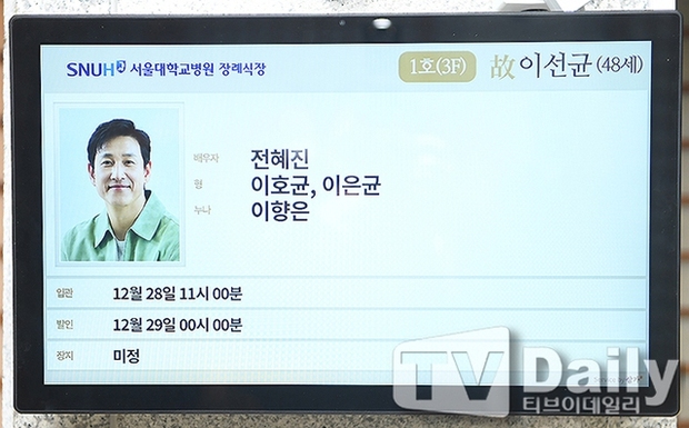 Đến chiều 27/12, những hình ảnh đầu tiên trong tang lễ "Ảnh đế" xứ Hàn đã được hé lộ. Tang lễ của Lee Sun Kyun được tổ chức riêng tư ở Nhà tang lễ số 1 thuộc bệnh viện Đại học Quốc gia Seoul, chỉ có gia đình và những người thân thiết tham dự. Đến ngày 29/12, di hài tài tử Ký Sinh Trùng sẽ được đưa đi an táng tại Seonyeong, quận Buan, tỉnh Jeollanam. Những hình ảnh đầu tiên trong tang lễ đã được truyền thông Hàn Quốc hé lộ.
