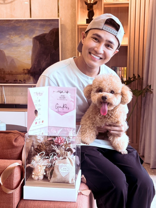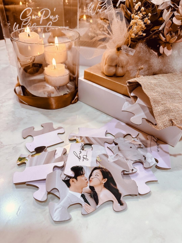 Theo đó, Puka và Gin Tuấn Kiệt chuẩn bị thiệp cưới rất chỉn chu, đặt bên trong một hộp hoa sen đá xịn xò. Đặc biệt, cô dâu chú rể cũng gửi kèm quà cưới là những ngọn nến thơm, túi vải có dán tên riêng của từng khách mời. Huỳnh Lập cho biết 2 người bạn thân đã tự lên ý tưởng rất công phu, tỉ mỉ cho từng hộp thiệp để gửi đến quan khách. Điều ấn tượng là khách mời phải tự tay sắp xếp những mảnh ghép cắt ra từ bức ảnh của cặp đôi mới biết được địa điểm tổ chức đám cưới.