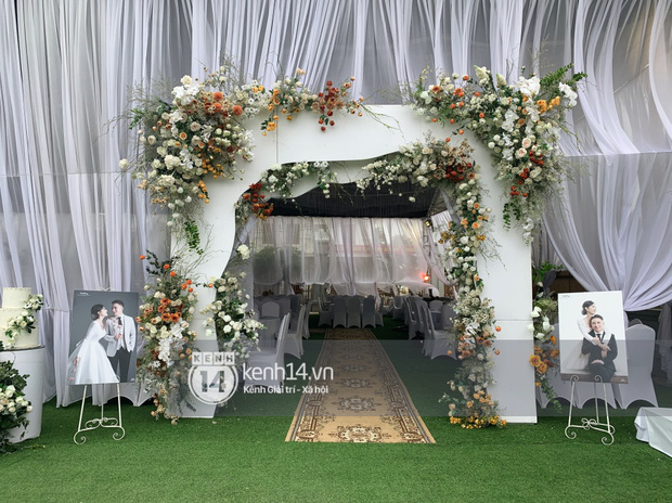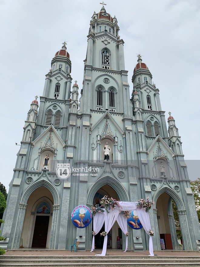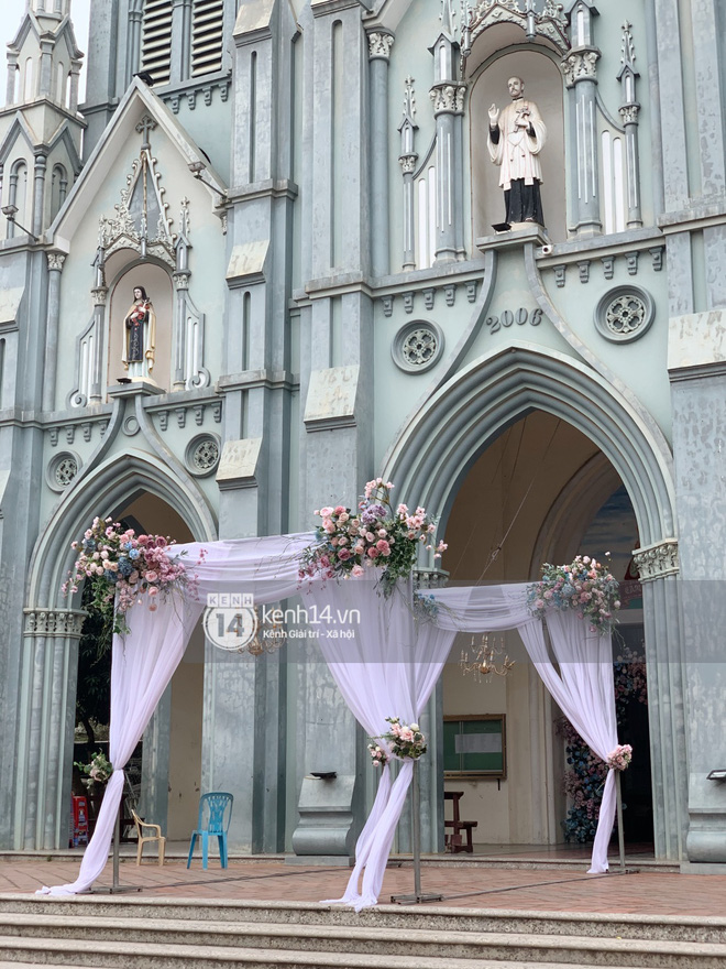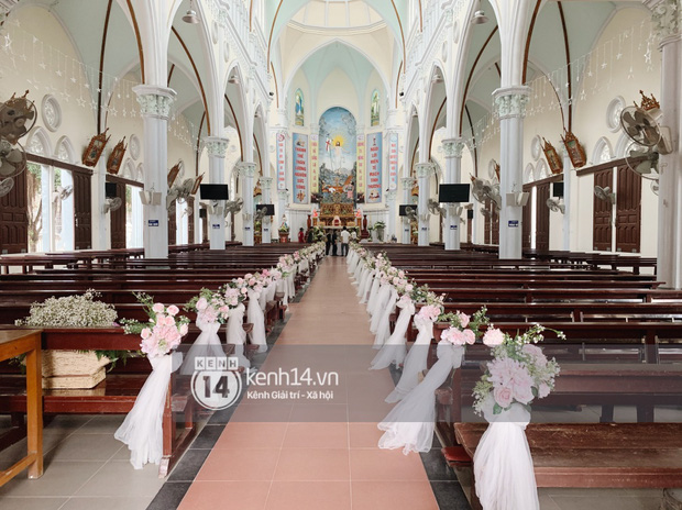 Có thể thấy cô dâu, chú rể đã dùng rất nhiều hoa tươi để phủ kính lễ đường trông lung linh như cổ tích. Đặc biệt, ở cổng đón khách, hình ảnh cưới của chú rể Phan Mạnh Quỳnh và cô dâu Khánh Vy cũng được công khai, nhìn nụ cười hạnh phúc của đôi tân lan tân nương khiến ai cũng vui lây. Vào tối nay, cặp đôi sẽ tổ chức thánh lễ ở nhà thờ, sau đó tiệc chiêu đãi người thân, bạn bè sẽ diễn ra vào trưa mai (ngày 17/4).