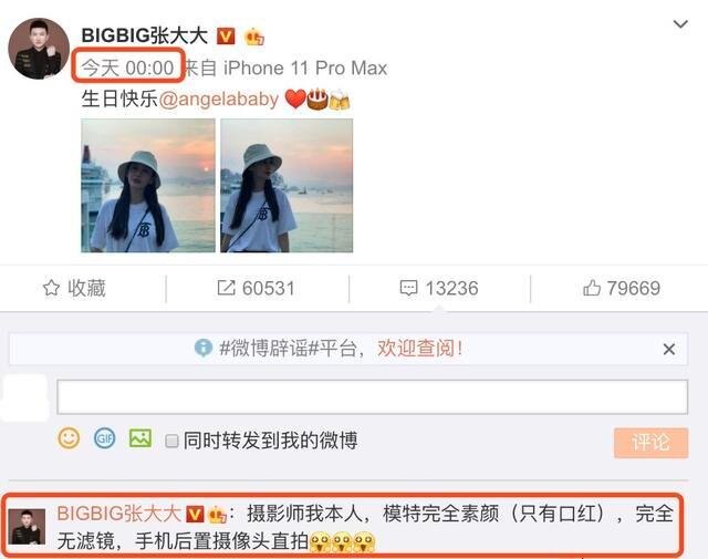 Bài đăng chúc mừng sinh nhật của Huỳnh Hiểu Minh “trống vắng” đến nỗi không hề có một bức hình nào về người vợ của mình. Nhìn sang bài viết của Trương Đại Đại – bạn thân của Angelababy cũng canh đúng 0 giờ để gửi lời chúc mừng sinh nhật kèm theo hai tấm ảnh của nàng tiểu hoa do chính tay anh chụp lại: “Bản thân là người chụp ảnh, cô người mẫu trong hình trang điểm đơn giản (chỉ tô son). Không photoshop, chụp từ camera sau của điện thoại”, nhằm nhấn mạnh vẻ đẹp của cô bạn thân. Xét về sự chân thành, Trương Đại Đại còn tâm lý, chỉn chu hơn cả ông xã của Baby.