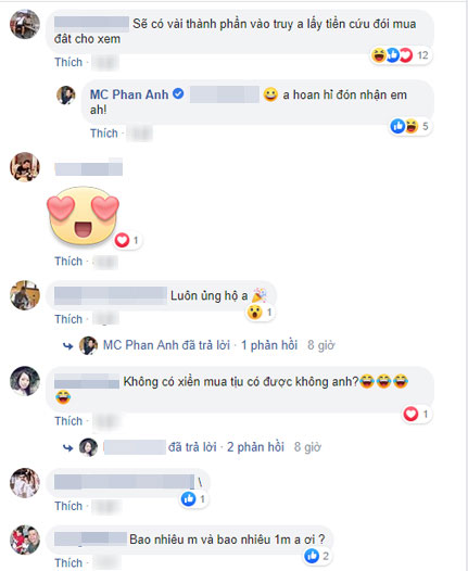 Bên dưới bình luận, một cư dân mạng nửa đùa nửa thật cảnh báo Phan Anh: "Sẽ có vài thành phần vào truy anh lấy tiền cứu đói mua đất cho xem". Đáp lại, nam MC tỏ ra bình thản: "Anh hoan hỉ đón nhận em ah!"