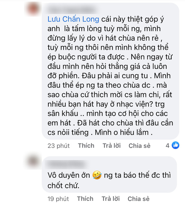 Mặc dù Lưu Chấn Long không đưa ra bằng chứng và người trong cuộc cũng chưa lên tiếng phản hồi nhưng bên dưới bình luận này, nam ca sĩ đã bị dân mạng chỉ trích dữ đội. Đa phần khán giả cho rằng Lưu Chấn Long đang mượn scandal của các đồng nghiệp để chiêu trò, tạo sự chú ý. 1 netizen cảm thấy bất bình liền đáp trả Lưu Chấn Long ngay và luôn: "Cái này mình góp ý anh là tấm lòng tuỳ mỗi người, mình đừng lấy lý do vì hát chùa nên rẻ, tuỳ mỗi người thôi mình không ép buộc người ta được. Nên ngay từ đầu, mình nên hỏi thẳng giá cả cho đỡ phiền. Mình đâu thể ép người ta theo chùa được".