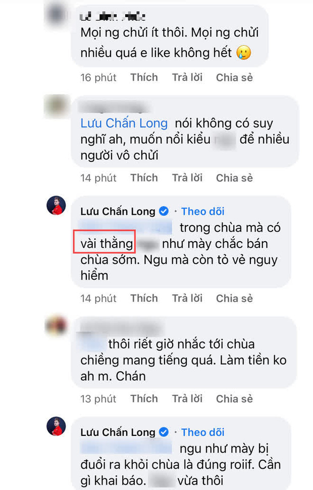 Ngoài ra, Lưu Chấn Long cũng khiến dân tình phẫn nộ dữ dội khi dùng lời lẽ thô tục, gọi khán giả là "thằng" để đáp trả khi bị tấn công vì tố Quang Lê vô lý. Liên lạc Quang Lê, nam ca sĩ cho biết chưa nắm thông tin này.