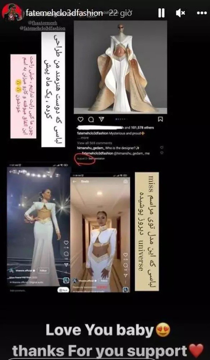 Sau khi thông tin này được lan truyền trên mạng xã hội, nhà thiết kế người Iran cũng chính thức lên tiếng tố cáo màn copy ý tưởng của nhà thiết kế Linh San.