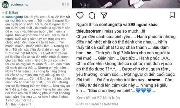 Vào tháng 11/2014, người hâm mộ bắt gặp Sơn Tùng ấn "thả tim" cho status bày tỏ nỗi nhớ nhung và định nghĩa về tình yêu sâu đậm của Thiều Bảo Trâm.