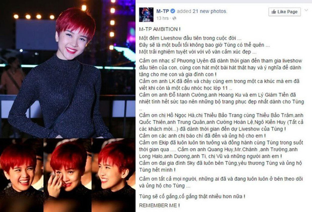 Vào năm 2016, Thiều Bảo Trâm tới dự live show "Chuyến bay đầu tiên" của Sơn Tùng. Thiều Bảo Trâm cùng cười và khóc với nam ca sĩ trong suốt đêm diễn. Sau liveshow đầu tay, trên trang cá nhân, Sơn Tùng cũng gửi lời cảm ơn tới các cộng sự và đồng nghiệp, trong đó có Thiều Bảo Trâm. Đây là lần hiếm hoi giọng ca người Thái Bình nhắc tới tên bạn gái tin đồn trên mạng xã hội.