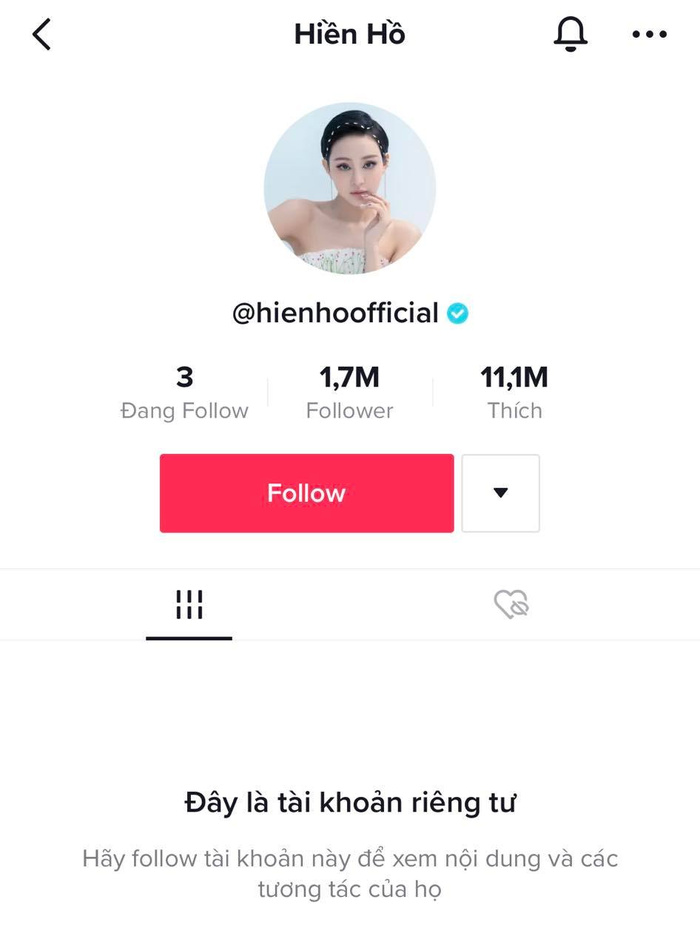 Nếu như các trang mạng xã hội của Hiền Hồ như Facebook, Instagram, Hiền Hồ đều đã khóa lại thì kênh TikTok của cô nàng giữ nguyên, nhưng chuyển về chế độ riêng. Tuy nhiên theo như quan sát thì cô nàng dường như vừa mới ấn follow một tài khoản nào đó.