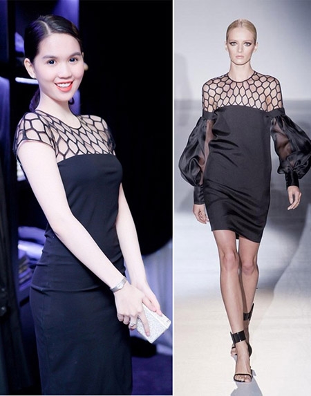 Chiếc váy đen huyền bí này là một trong những bộ cánh 0 điểm của người đẹp. Đường chiết eo vụng về khiến Ngọc Trinh kém duyên trước ống kính. |