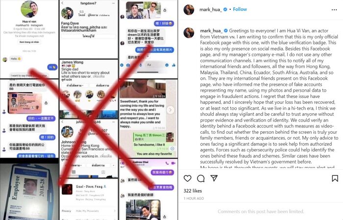 Chuyện bị giả mạo danh tính trên không gian mạng đã là một câu chuyện nhức nhối trên mạng xã hội, nhất là khi những tài khoản giả mạo đó đều sử dụng cho mục đích tiêu cực. Nam diễn viên Hứa Vĩ Văn mới đây đã trở thành nạn nhân của việc giả mạo danh tính này, khiến anh phải lên tiếng đính chính trên trang cá nhân chính thức.