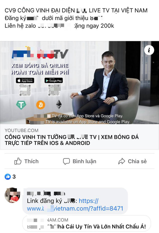 Mới đây, hình ảnh nam cầu thủ Công Vinh xuất hiện trong nhiều video quảng cáo cho một ứng dụng được cho là để "xem bóng đá trực tuyến" có tên *** Live TV đang khiến cộng đồng hoang mang, đặt nhiều nghi vấn.